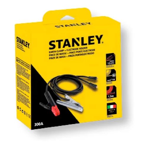 Kit STANLEY® 98010STA con grampa a tierra y portaelectrodos DINSE 10/25, capacidad 300A, cable de 1.5 m, diseño profesional y fabricación italiana. Ideal para soldadura segura, eficiente y de alto rendimiento técnico.