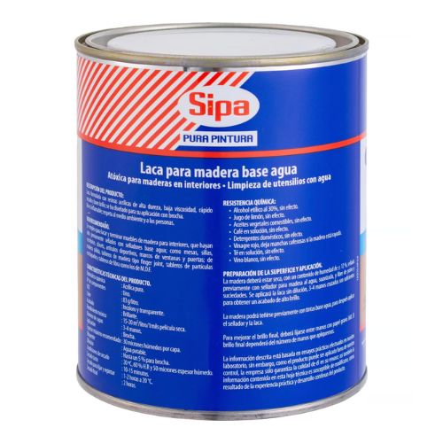 Esta laca para madera, de la prestigiosa marca Sipa, tiene un contenido de 800 cm3 y una base de agua, lo que la hace amigable con el medio ambiente. Su secado final es rápido, en solo 2 horas, y el tiempo de espera entre capas es de 1 hora. Además, ofrece resistencia al agua, protegiendo tus muebles de derrames y humedad. Es ideal para uso interior y proporciona una terminación lisa y suave.