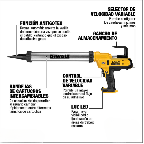 La Pistola Adhesiva DEWALT DCE580B 20V MAX es la herramienta ideal para quienes buscan precisión, control y versatilidad en la aplicación de adhesivos y pegamentos industriales. Diseñada para trabajar con cartuchos de 300 a 600 ml, permite un flujo constante y uniforme, asegurando acabados profesionales en todo tipo de superficies. Su funcionamiento inalámbrico brinda libertad de movimiento, facilitando el acceso a espacios difíciles y reduciendo la fatiga del usuario. El diseño ergonómico y equilibrado mejora la comodidad durante tareas prolongadas, mientras que la construcción robusta garantiza durabilidad y confiabilidad en aplicaciones exigentes de construcción, carpintería, remodelación y bricolaje.