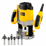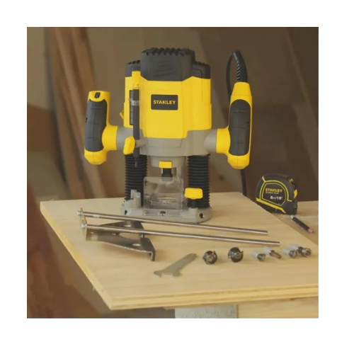 La Rebajadora STANLEY 1200W SRR1200-B2C ofrece precisión y potencia, con fresas, mordazas y puerto de extracción de polvo para un trabajo limpio y profesional.
