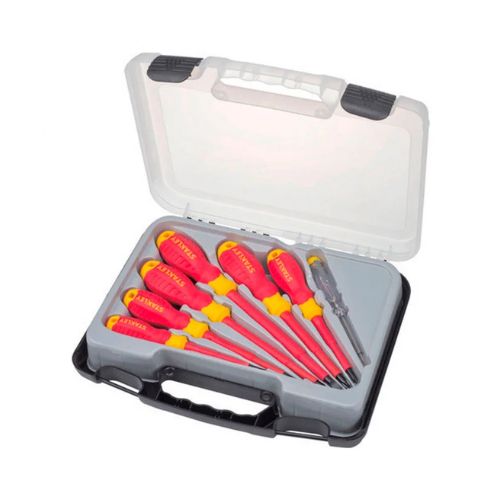 Set de Destornilladores Aislados STANLEY® STMT60175-LA de 7 piezas, incluye planos, Phillips y probador de corriente. Certificados hasta 1.000V, con mango ergonómico, barra de acero Cromo-Molibdeno y aislamiento inyectado. Ideal para trabajos eléctricos seguros y profesionales.