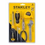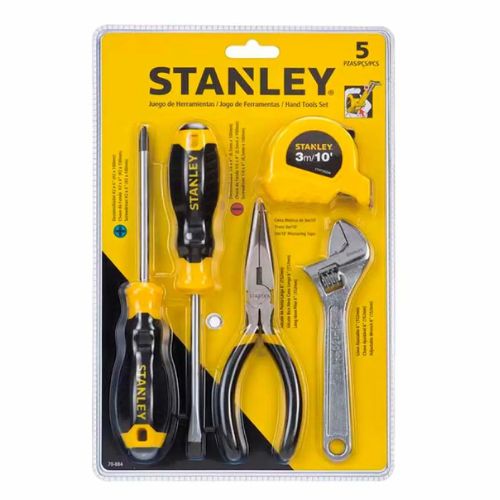 Set STANLEY® 70-884 de 5 piezas, con destornilladores, alicate, llave ajustable y cinta métrica, ideal para reparaciones básicas, tareas técnicas y uso doméstico. Compacto, resistente y listo para trabajar.