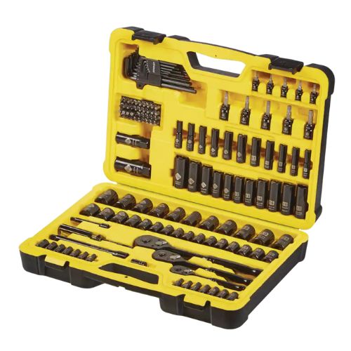 Set Mecánico STANLEY® STMT75071-LA de 150 piezas, con ratchets 1/4″, 3/8″ y 1/2″, dados métricos y SAE, puntas, llaves Allen y extensiones, en estuche cromado profesional. Ideal para mecánica, mantenimiento y formación técnica exigente.