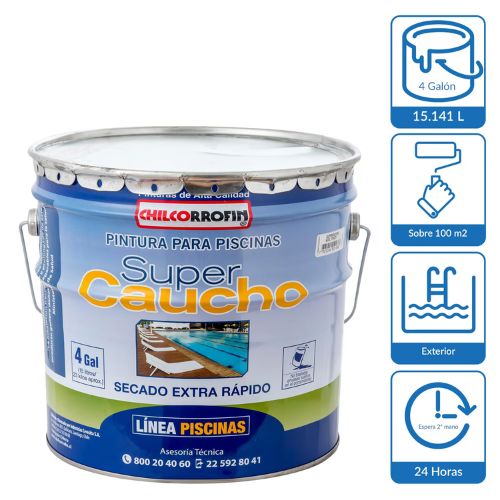 El Supercaucho Azul Tahiti es una pintura para piscinas de hormigón estucado, ideal tanto para piscinas nuevas como para repintar. Su base solvente proporciona una protección UV, manteniendo los colores vibrantes por más tiempo. El tiempo de secado entre manos es de 24 horas y el secado final de 72 horas. Aplica de forma sencilla en exteriores, logrando un acabado mate perfecto.